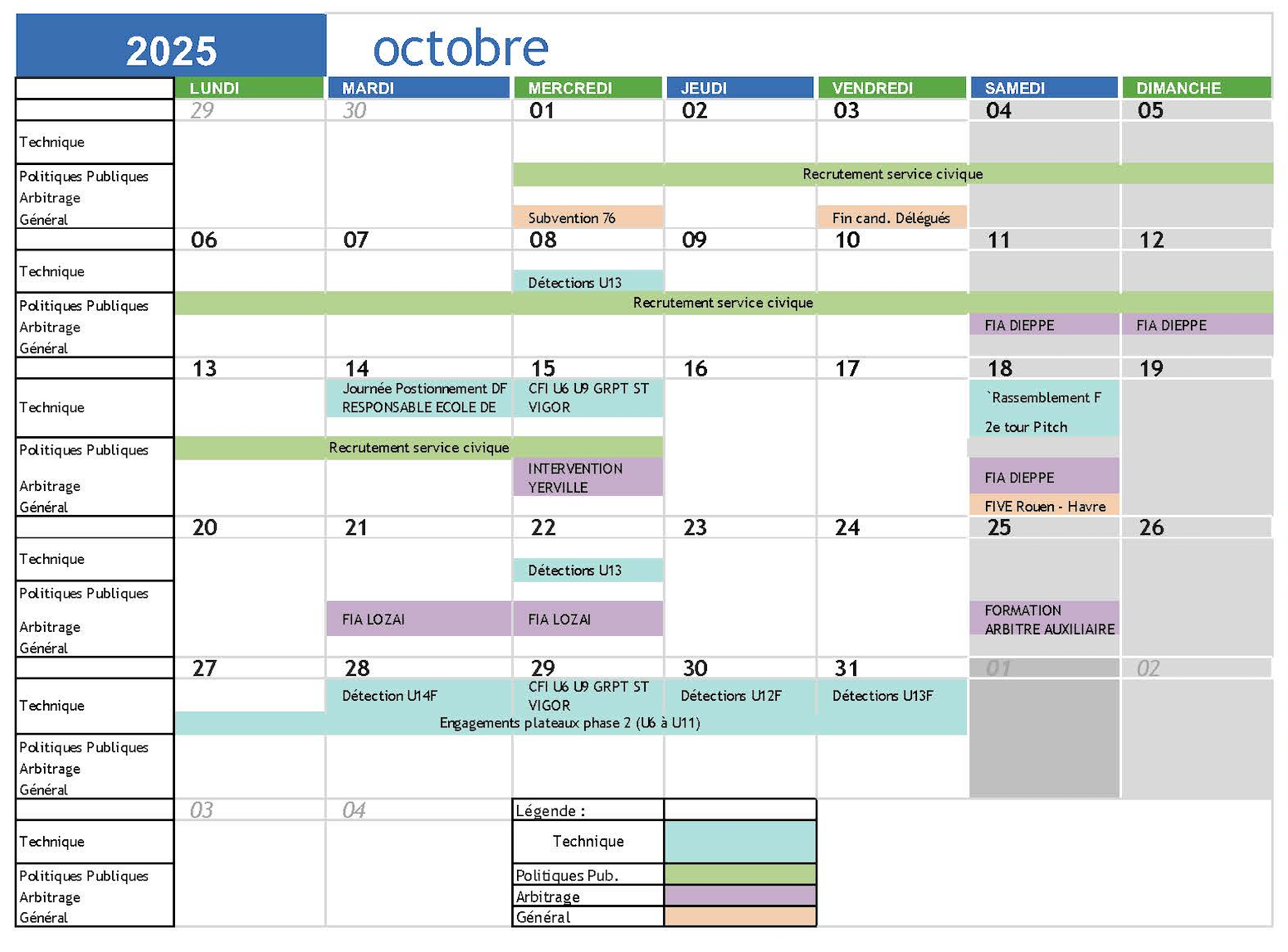 Afin d’aider chaque club à anticiper ses actions, le District de Football de Seine-Maritime met en place un calendrier mensuel, recensant les principales échéances du mois à venir.