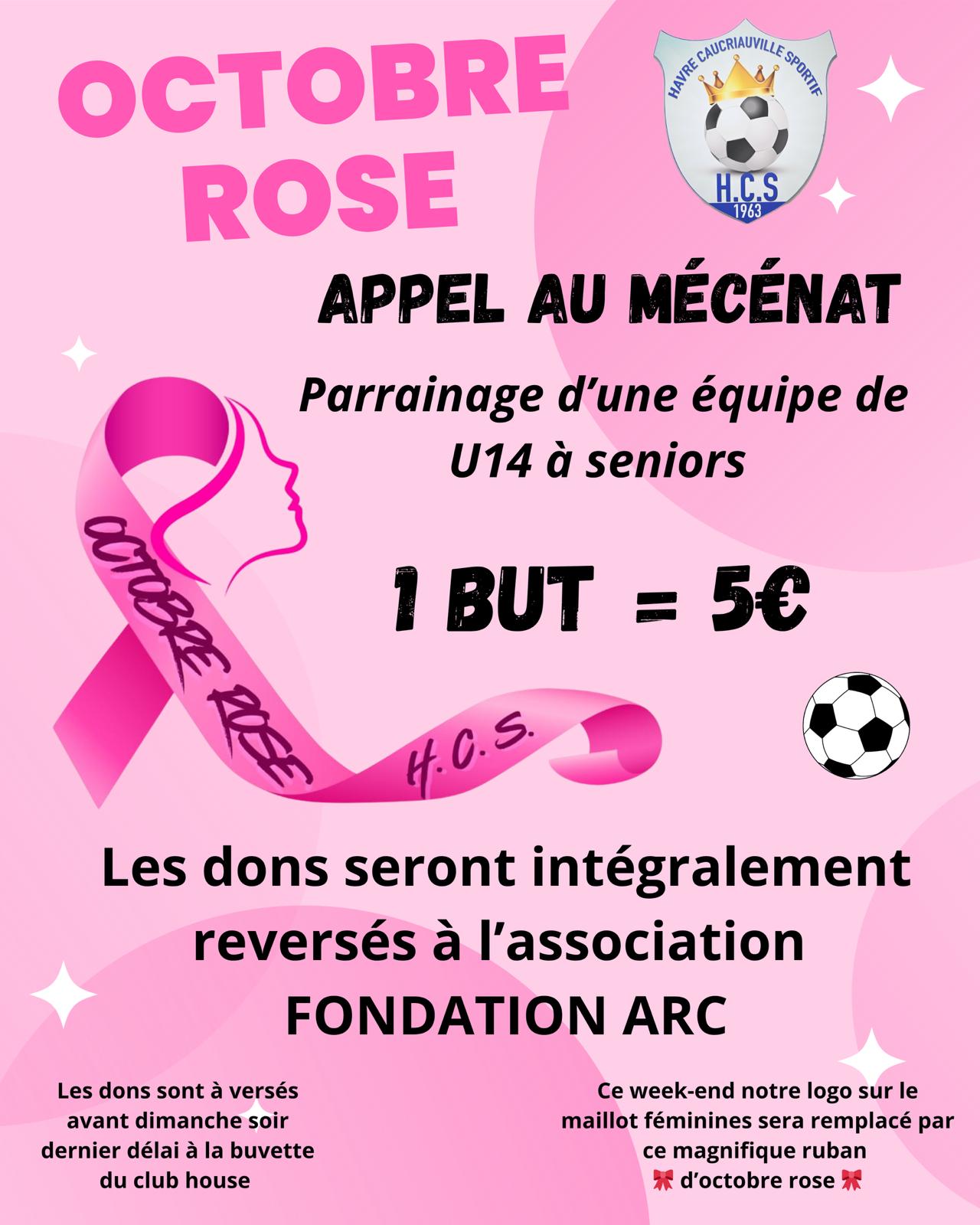 Le club organise un appel au mécénat dont l’ensemble des bénéfices sera reversé à la Fondation ARC. Chaque mécène pourra parrainer une équipe foot à 11 des U14 jusqu’aux séniors et s’engagera à verser 5€ par but marqué par l’équipe choisie durant le week-end du 18 au 19 octobre.