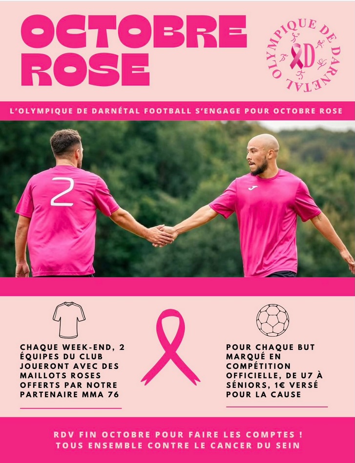 Le club apporte son soutien à Octobre Rose, pendant le mois d’octobre les capitaines foot à 11 U15, U18, séniors et vétérans porteront un brassard rose en soutien à la cause.