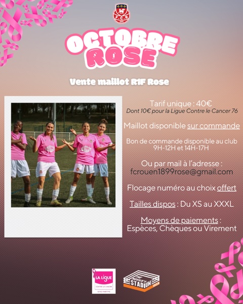 Le club propose une vente de maillot édition limitée « Octobre Rose » de l’équipe séniors R1F durant le mois d’octobre.